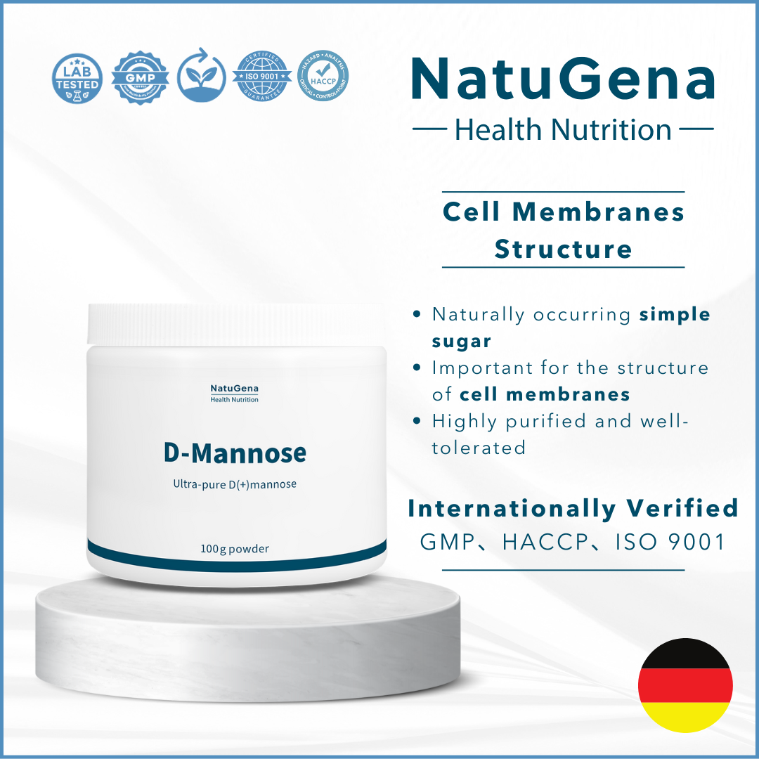 D-Mannose from NatuGena – contains 100g of highly pure D (+) Mannose powder in an easy-to-dose powder. D-Mannose is easily utilized by the body and is present in many organisms as a component of proteins and cell membranes.